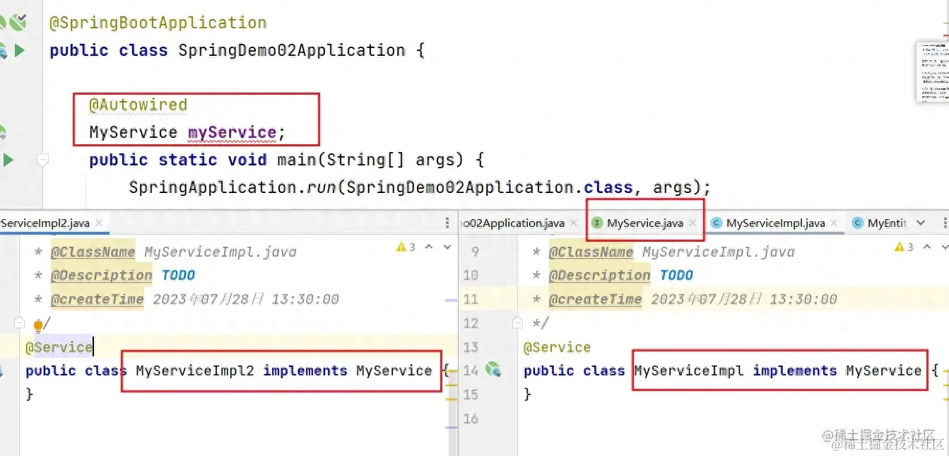 - 在我们日常使用Springboot开发中此情况常见于一个service接口有多个实现类,因为@Autowired注解进行依赖注入时是默认按属性类型的,此时对该service进行依赖注入时,容器中出现多个类型相同bean(因为它有多个实现类),容器不知道为它注入哪个,只能走抛异常的方式。