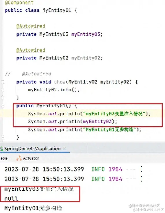 也就是说标注了@Autowired注解的变量要等到类完全加载完才会将相应的bean注入。所以不要在构造器中使用被@Autowired注解标注的变量。