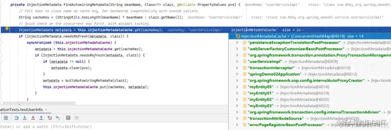 蓝色那一行,底层根据beanName:“userServiceImpl”到缓存中找到类的元数据,