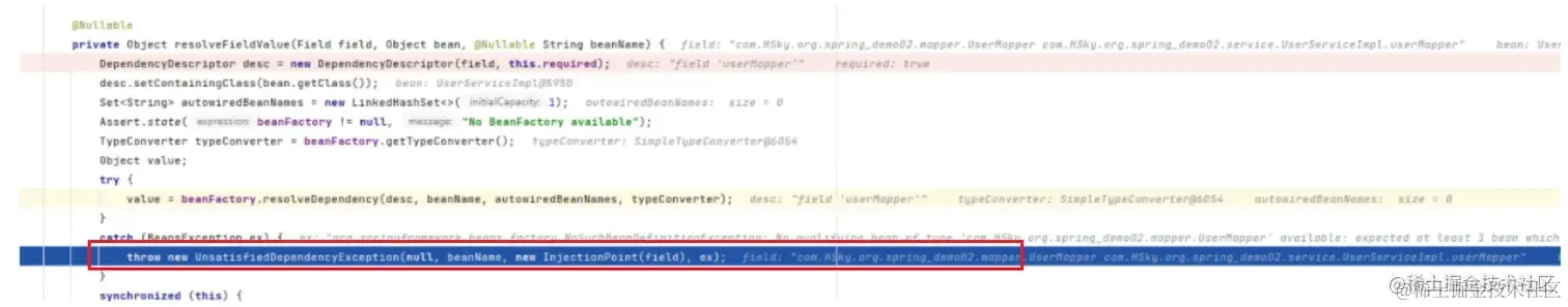 发现容器中并没有匹配的bean(前面故意没在mapper接口上加mapper注解),执行报异常的操作