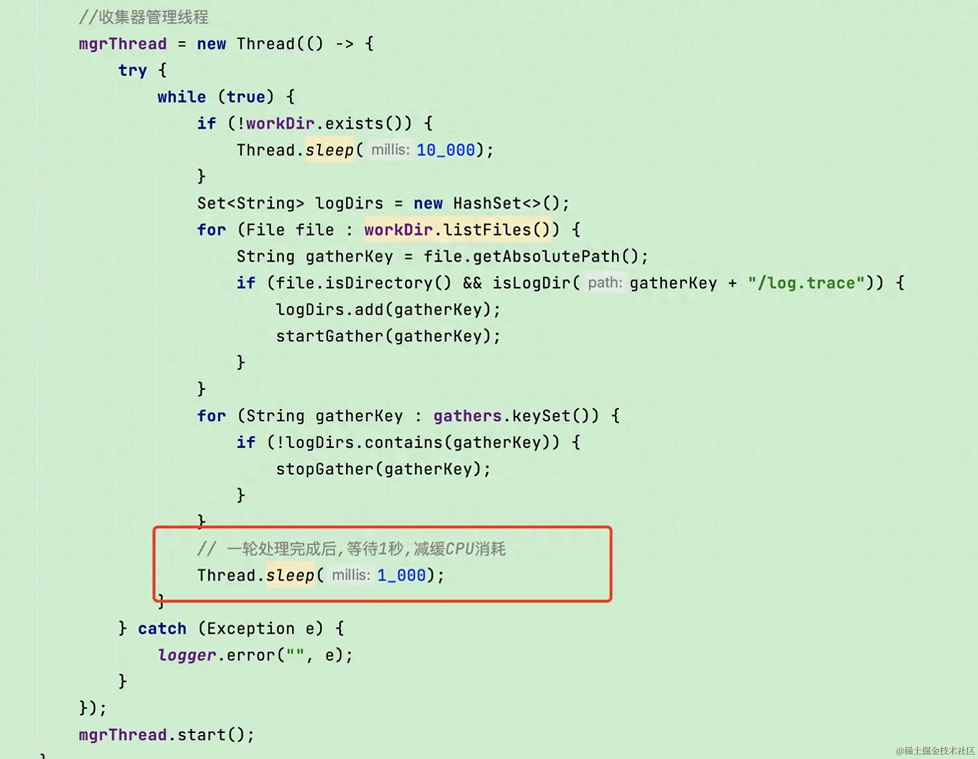 最后发现此处代码是一个死循环,一直在监测日志文件状态,并且无等待