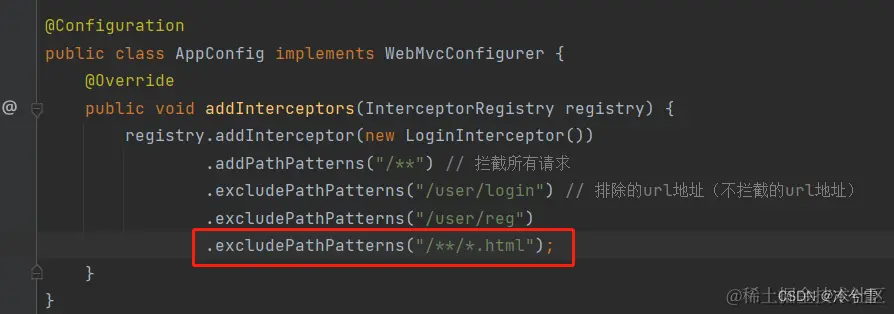 - 将自定义拦截器加入WebMvcConfigurer 的 addInterceptors 方法中。
