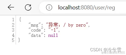 以上方法表示,如果出现了异常就返回给前端⼀个 HashMap 的对象,其中包含的字段如代码中定义的那样。 我们可以针对不同的异常,返回不同的结果。