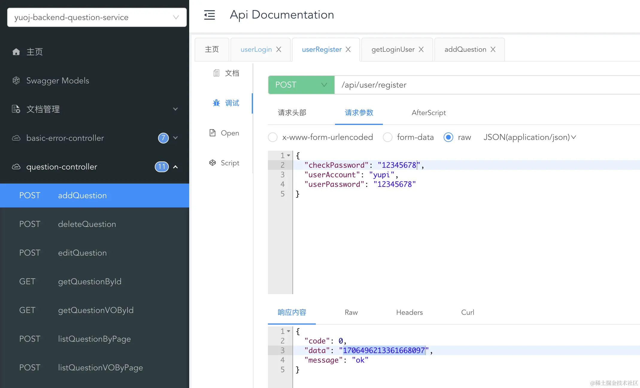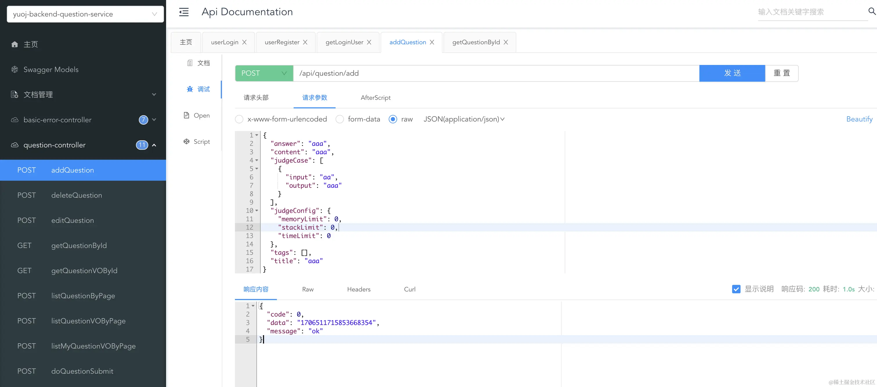 依次调用用户注册 => 登录 => 获取登录用户信息 => 创建题目接口,全部执行成功。