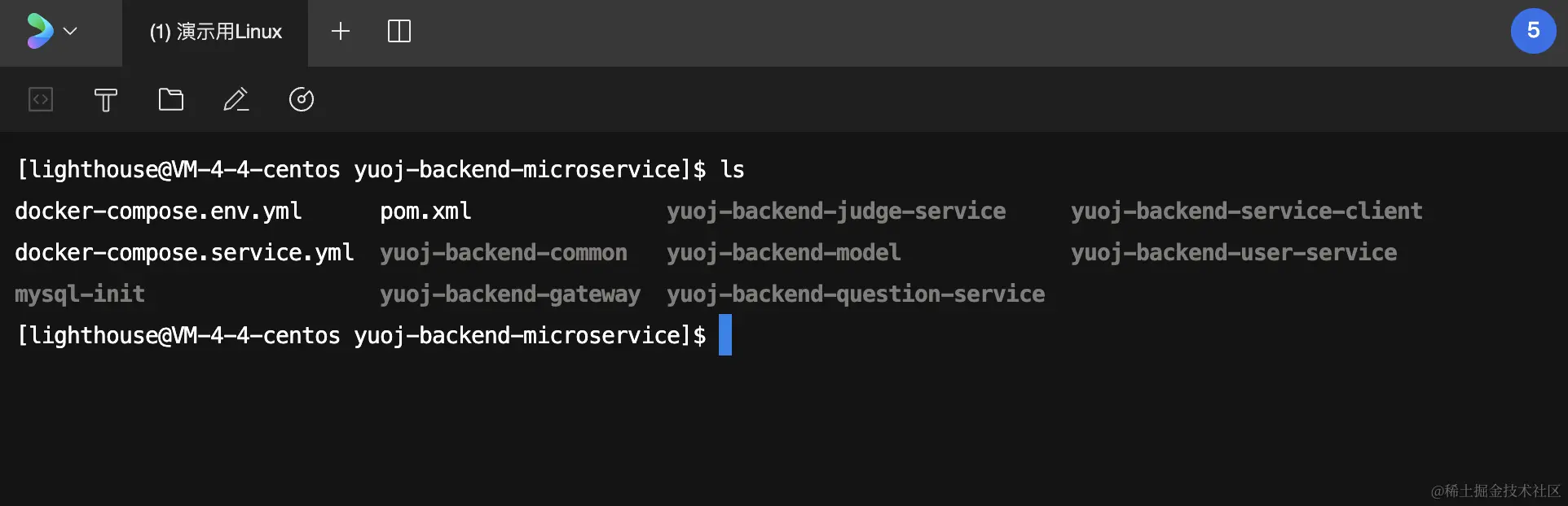上传成功,在服务器对应路径(/code/yuoj-backend-microservice)下能看到已上传的文件列表: