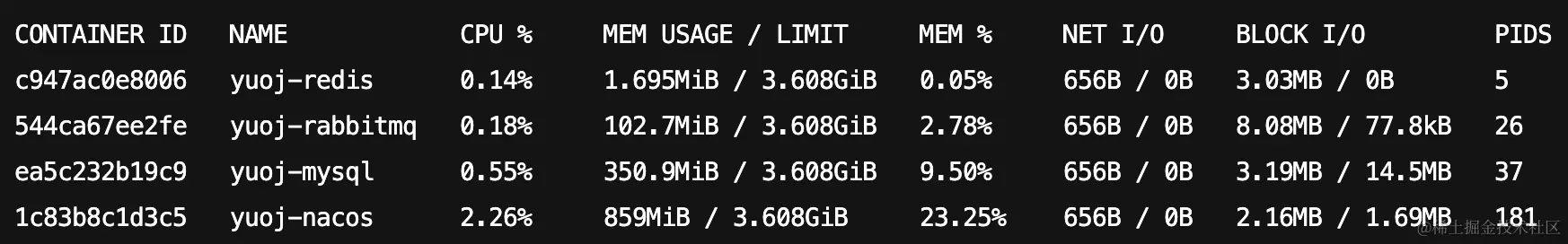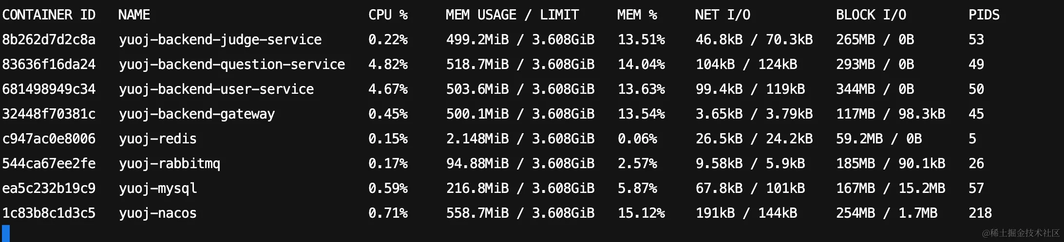 最后使用 docker stats 命令查看 Docker 容器的状态,发现总共的内存占用大概 3 G,也就是说 4 G 内存的服务器是完全足够小型微服务项目的部署了~