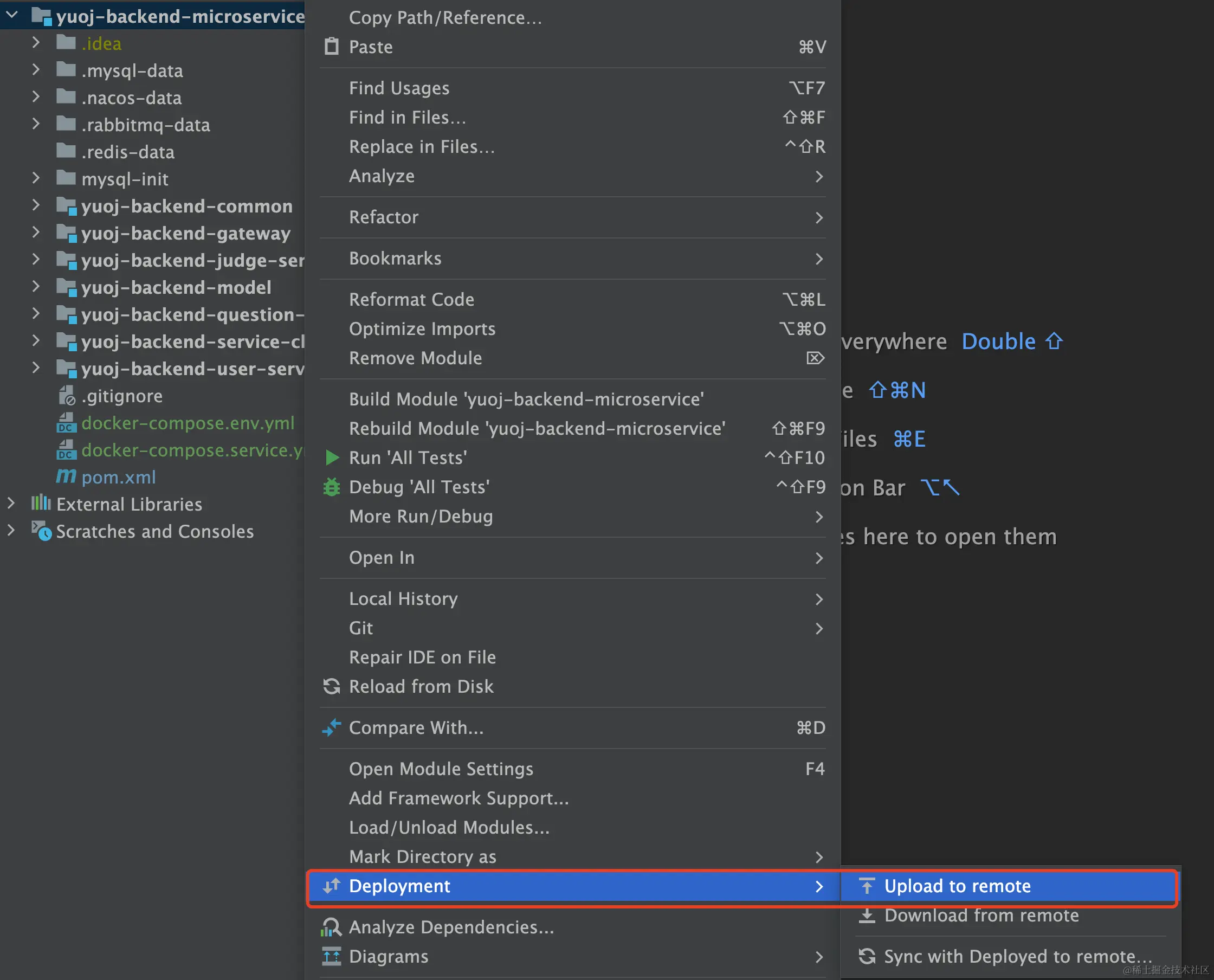 上传前记得先删除无用的文件,然后右键项目根目录,点击部署上传代码: