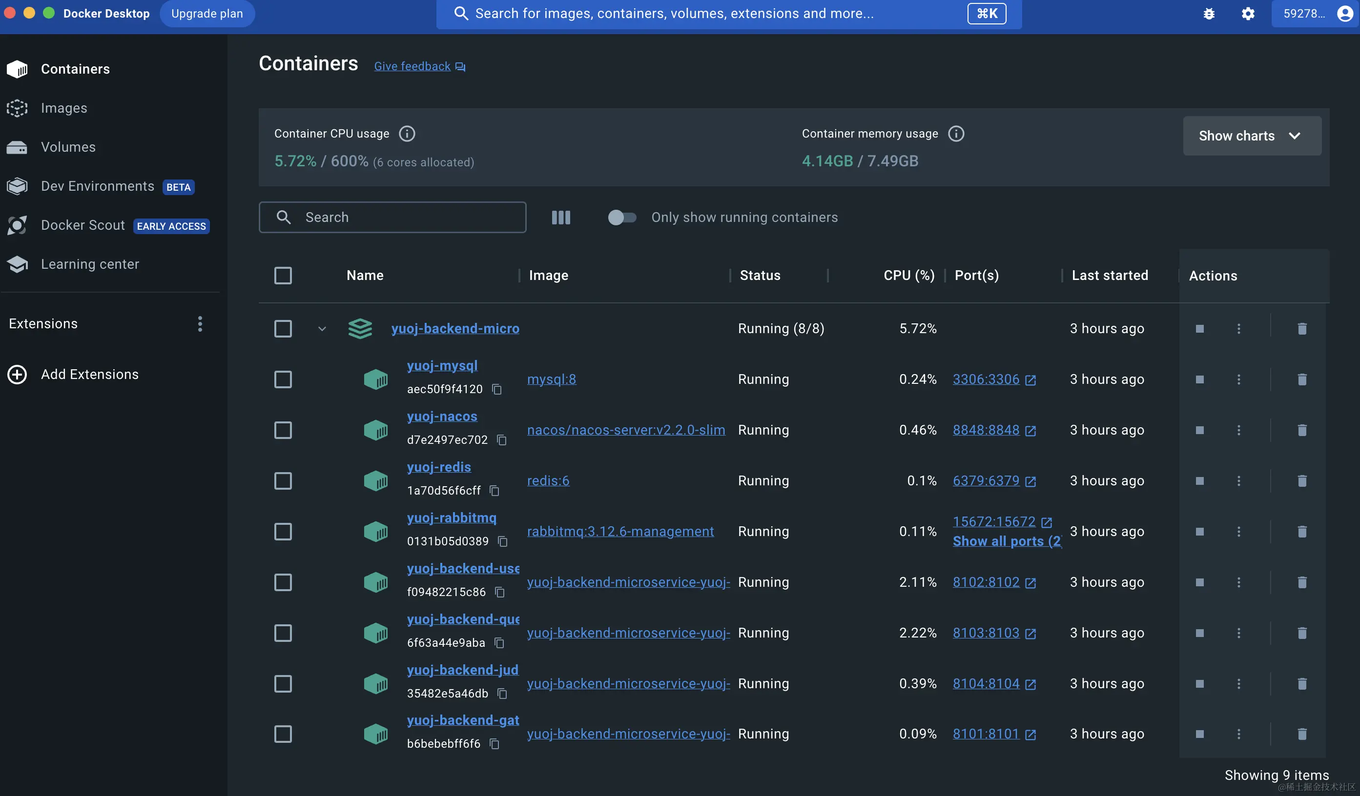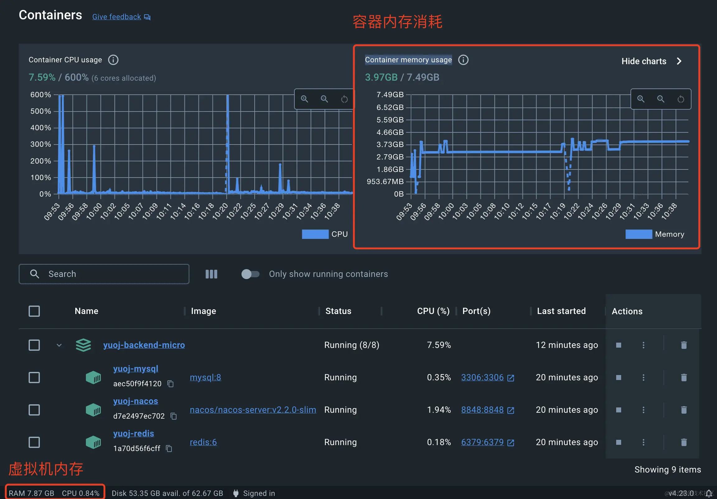 可以使用 Docker Desktop 直接查看内存占用,虚拟机内存大概占用了 8 个 G、容器实际内存占用了 4 个 G: