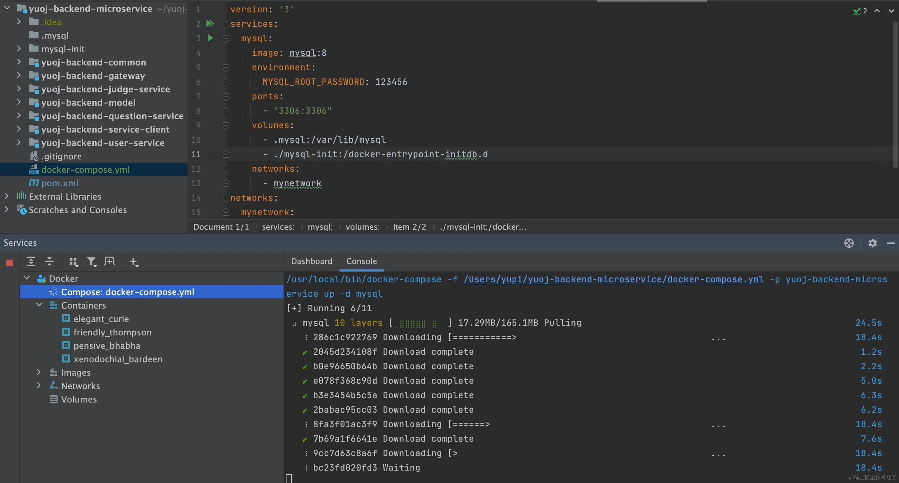 如果要部署微服务项目,可能要启动多个 Docker 容器,比如 MySQL 容器、用户服务容器等。这时就需要 Docker Compose 了。它是一个容器编排助手,用于集中管理多个 Docker 容器的启动和协同工作。可以在一个配置文件中集中定义所有容器以及它们的关系。然后,可以使用一行命令启动所有容器,而不需要手动运行多个命令。