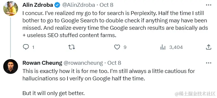 有网友表示,虽然在简单问题上,LLM 的表现更好,但是对于大模型的「幻觉」问题依然保持谨慎态度他们使用谷歌搜索验证大模型的回复。