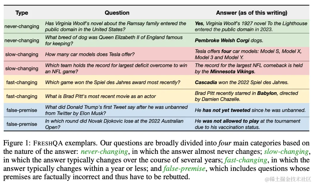 在这项工作中,研究者先是创建了一个名为「FRESHQA」的新型质量保证基准,用于评估现有 LLM 生成内容的事实性。FRESHQA 包含 600 个自然问题,大致分为图 1 所示的四大类。这些问题跨越了一系列不同的主题,具有不同的难度级别,并要求模型「理解」世界上的最新知识,以便能够正确回答。