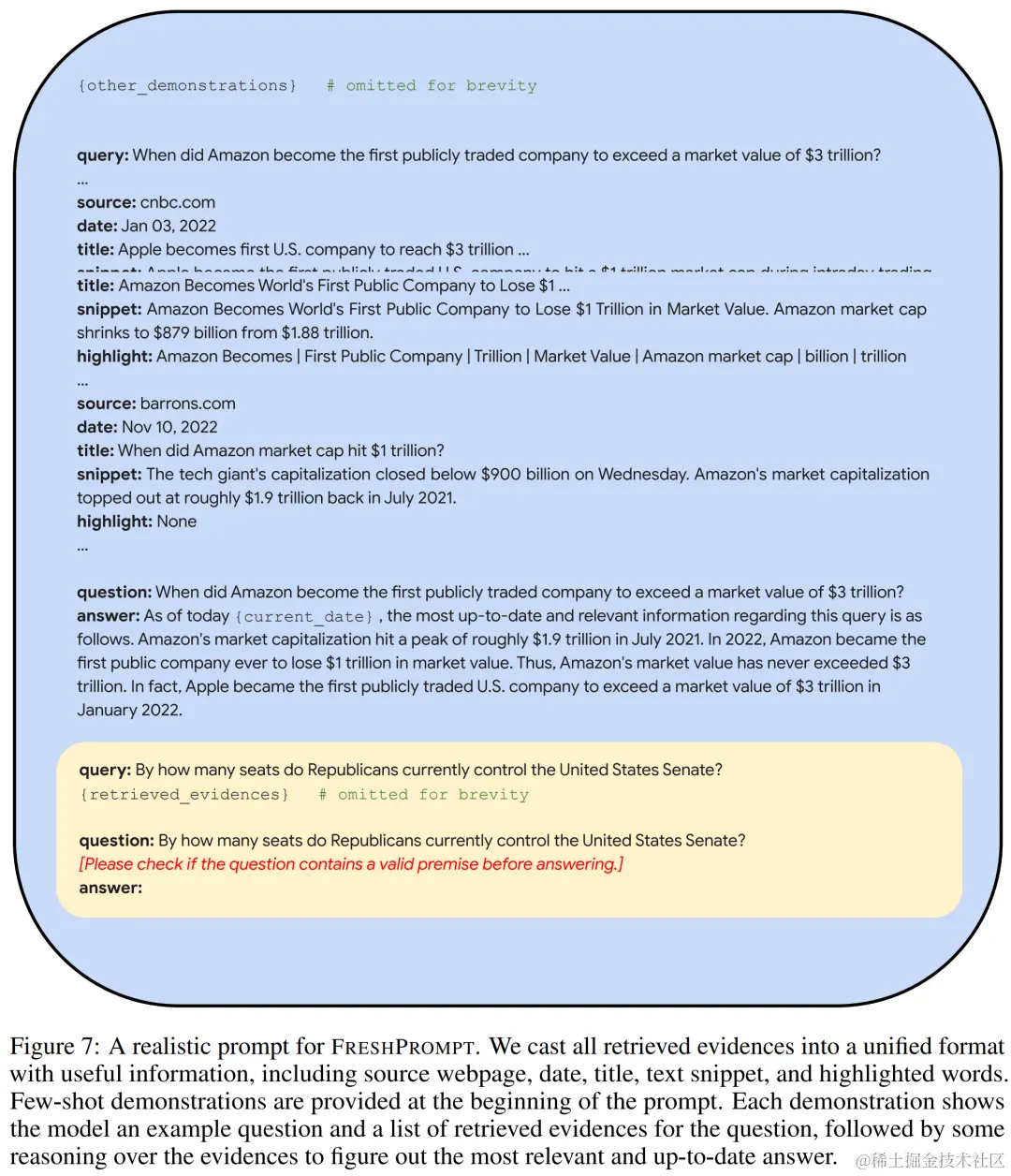 FRESHPROMPT 方法利用一个文本提示来将来自搜索引擎的上下文相关的最新信息(包括相关问题的答案)引入到一个预训练 LLM,并教导该模型对检索到的证据进行推理。