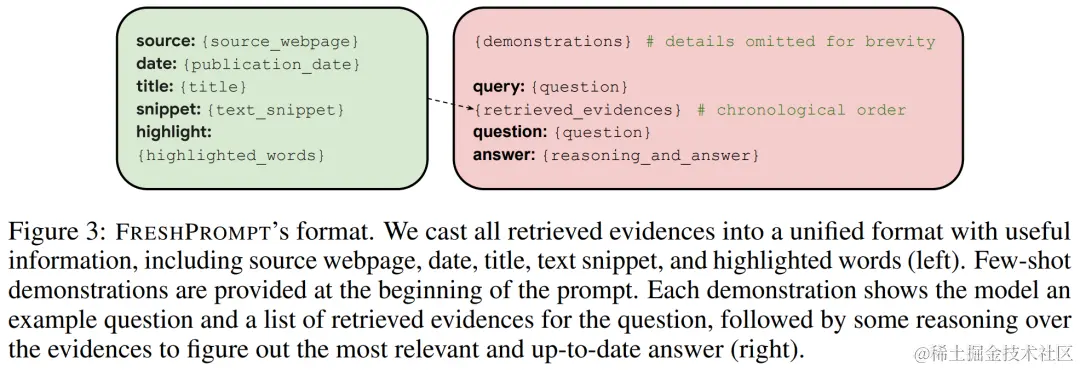 对于每个这样的结果,研究者提取了相关的文本片段 x 以及其他的信息,比如来源 s(如维基百科)、日期 d、标题 t 和高亮文字 h,然后创建包含 k 个检索到的证据的列表 E = {(s, d, t, x, h)}。接下来这些证据将转换成常见的格式(如上图 3 左),并通过上下文内学习来调整模型。此外为了鼓励模型基于最近的结果来专注于较新的证据,研究者从旧到新对提示中的证据 E 进行排序。
