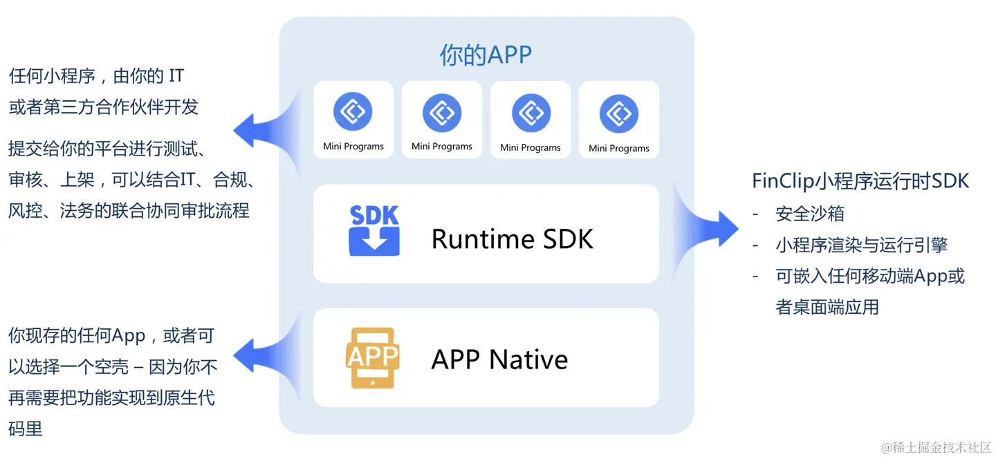 凡泰极客借鉴互联网成熟小程序技术方案,推出FinClip小程序容器技术,任何 App 均可以通过引入 FinClip小程序运行时 SDK 来获得运行小程序的能力,同时,它还提供一个后台管理系统,统一管理小程序的上架和下架,以及收集和分析小程序数据,对于开发人员,可谓是极其便捷了。