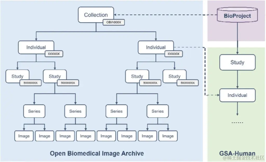 OBIA 采用 5 种数据对象 (Collection, Individual, Study, Series, Image) 进行数据组织,接受多模态、多器官、多疾病的生物医学图像提交。