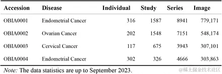 第 1 批提交给 OBIA 的资料来自 301 医院, 包括 3 种主要妇科肿瘤(子宫内膜癌、卵巢癌和宫颈癌)的影像数据。