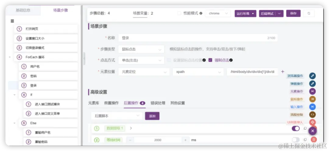 MeterSphere开源持续测试平台涵盖测试跟踪、接口测试、性能测试和UI测试等功能模块。MeterSphere的UI测试模块基于Selenium浏览器自动化方案构建,内嵌高度可复用的测试脚本,测试团队无需复杂的代码编写即可开展低代码的自动化测试。