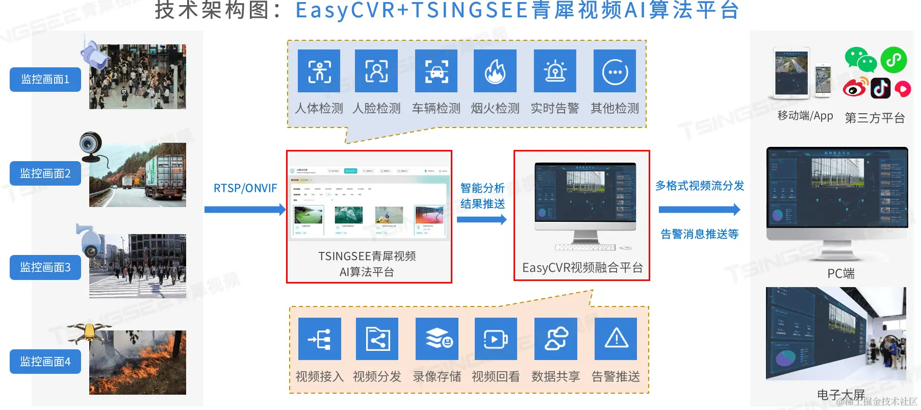 视频汇聚平台EasyCVR可支持多协议方式接入,包括主流标准协议国标GB28181、RTSP/Onvif、RTMP等,以及厂家私有协议与SDK接入,包括海康Ehome、海大宇等设备的SDK等。在视频流的处理与分发上,视频监控汇聚平台EasyCVR的性能也同样表现得很优秀,平台可对外分发多格式的视频流,包括RTSP、RTMP、HLS、HTTP-FLV、WebSocket-FLV、WebRTC格式,实现多端覆盖。感兴趣的用户可以前往演示平台进行体验或部署测试。