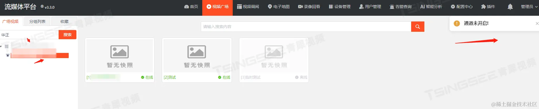 有用户反馈,在EasyCVR平台【视频广场】-【视频调阅】模块中的左侧设备列表中,当搜索后,点击设备通道进行播放时,出现了报错异常,弹出“通道未开启”的提示,如下图: