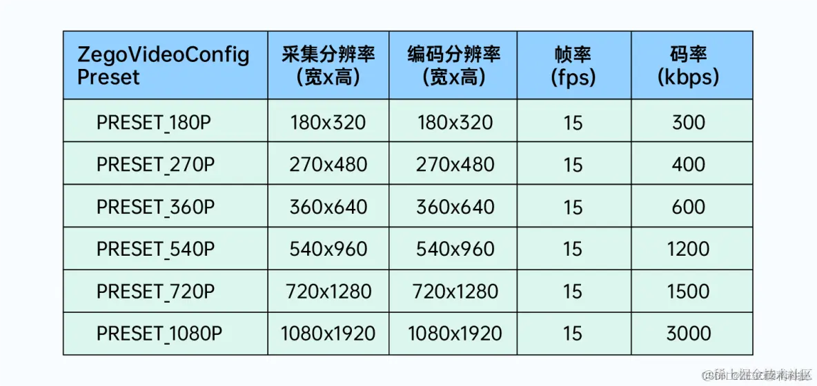 你也可以使用 ZEGO Express SDK 提供的预设组合值,ZegoVideoConfigPreset 的预设组合值如下:
