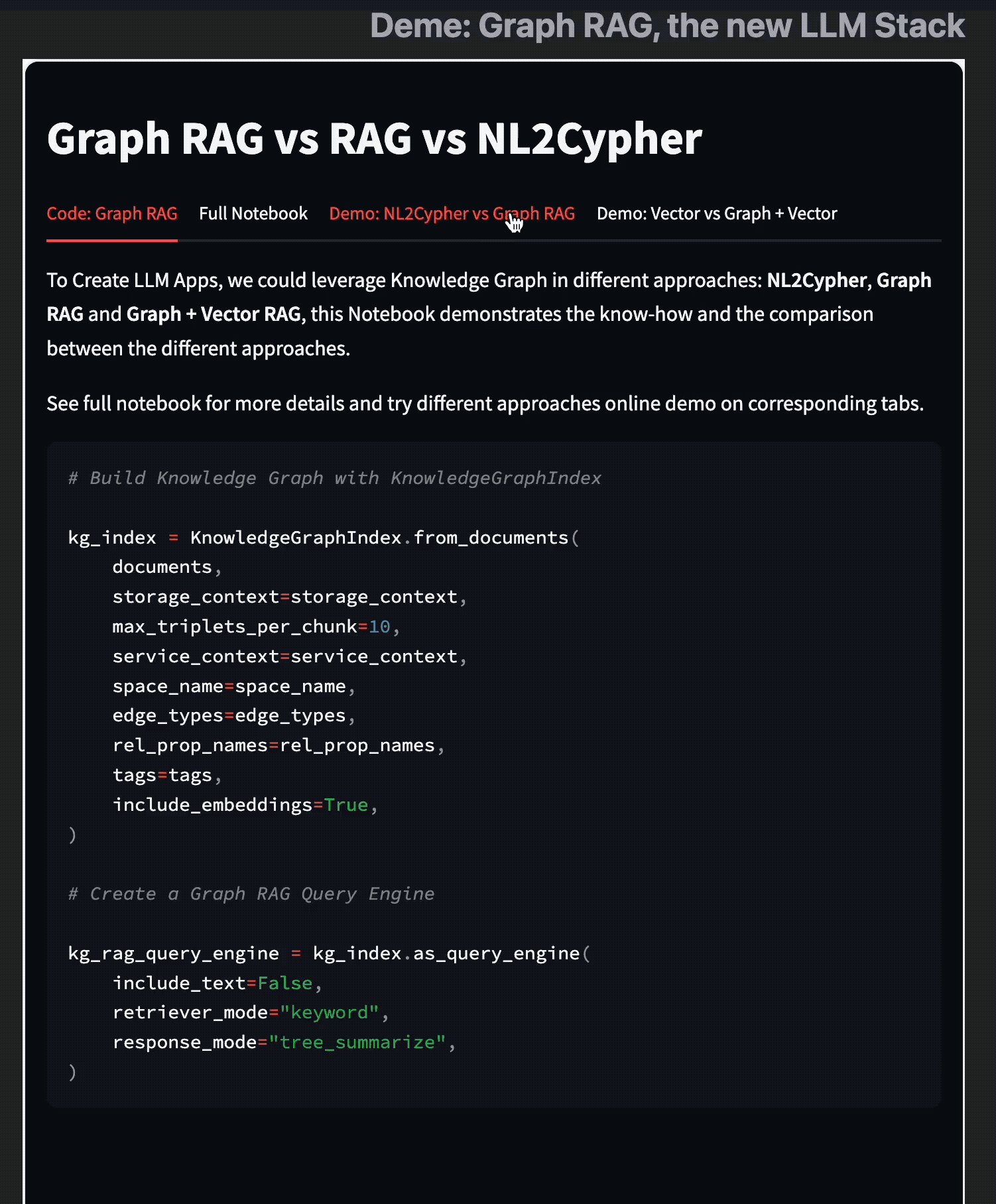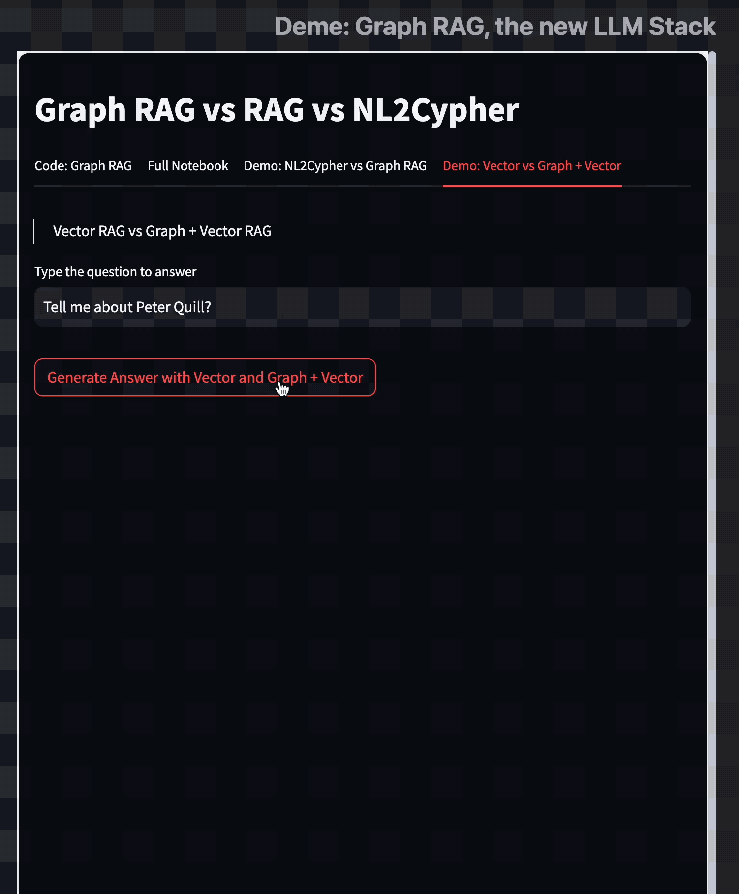 最后,我做了一个 Streamlit 的 Demo 来比较 Graph RAG 与 Vector RAG,从中我们可以看到 Graph RAG 并没有取代 Embedding、向量搜索的方法,而是增强了/补充了它的不足。