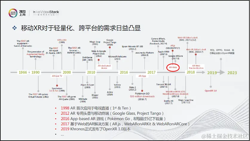 上图展示了XR技术的发展简史。从1998年AR首次应用于电视直播到AR专用头显、移动终端、基于APP的AR游戏和基于Web的AR解决方案陆续出现,再到OpenXR 1.0的发布,各大国内厂商加入OpenXR联盟,这些发展充分体现了XR追求移动化、轻量化和跨平台标准化的发展趋势。