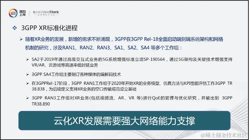总体来看,未来云化XR的发展将面临网络能力方面的需求和挑战。目前多个3GPP工作组也在针对5G低时延云游戏、AR/VR、多媒体编解码和XR业务QoE等方向展开研究。