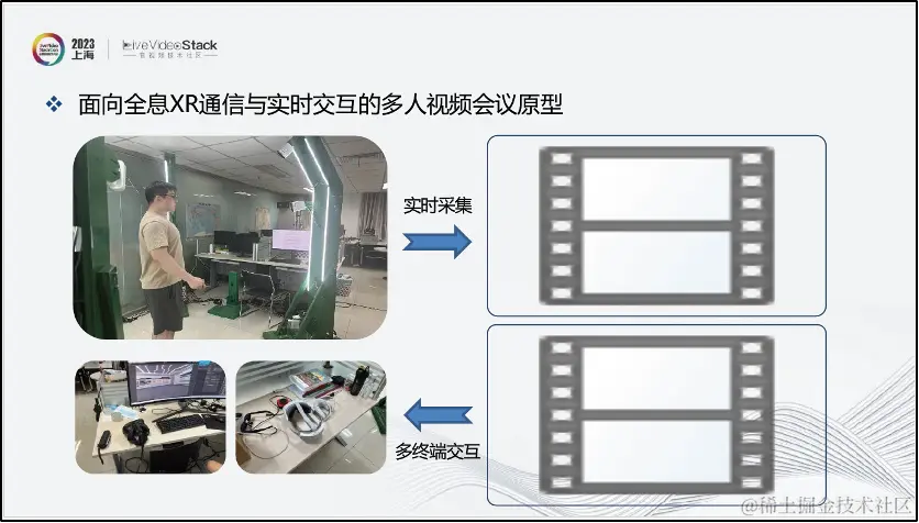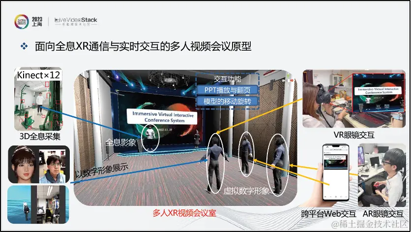 上图展示了我们基于云渲染的全息XR通信与实时交互多人视频会议场景。用户可通过不同终端进入会议室,并看以全息影像、数字人等不同的形象进行实时互动。