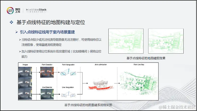 第二是针对楼梯间等特征点较少的场景改为使用线特征注册图像,使重建流程和定位能力更加稳定。