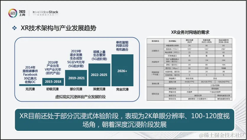 以上图表展示了XR的技术架构、产业发展趋势,以及XR业务的网络需求。目前来看,XR还处于部分沉浸式体验阶段,正朝着深度沉浸阶段发展,主要表现为单眼观看可达到2K分辨率,FOV处于100-120度范围内。