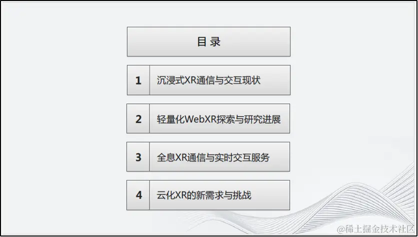 本次分享分为四方面:首先以囊括多种沉浸式技术为主旨谈谈沉浸式XR通信与交互现状,然后介绍我们从2017年至今关于轻量化跨平台WebXR技术的探索与研究进展,接下来介绍全息XR通信与实时交互服务,最后对云化XR的新需求与挑战进行总结。