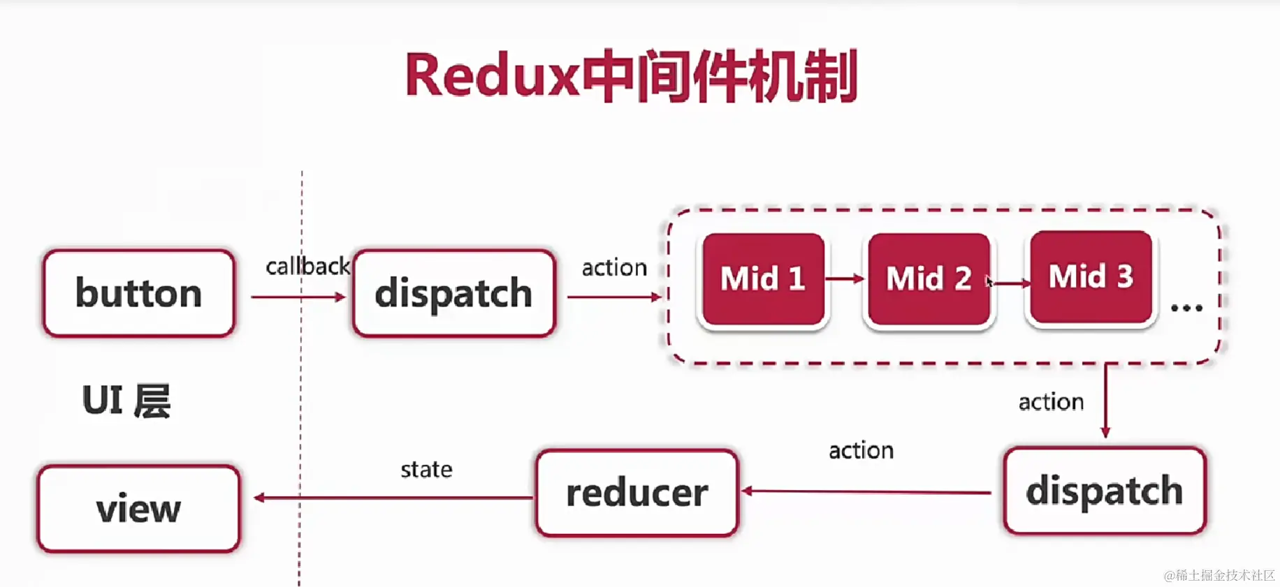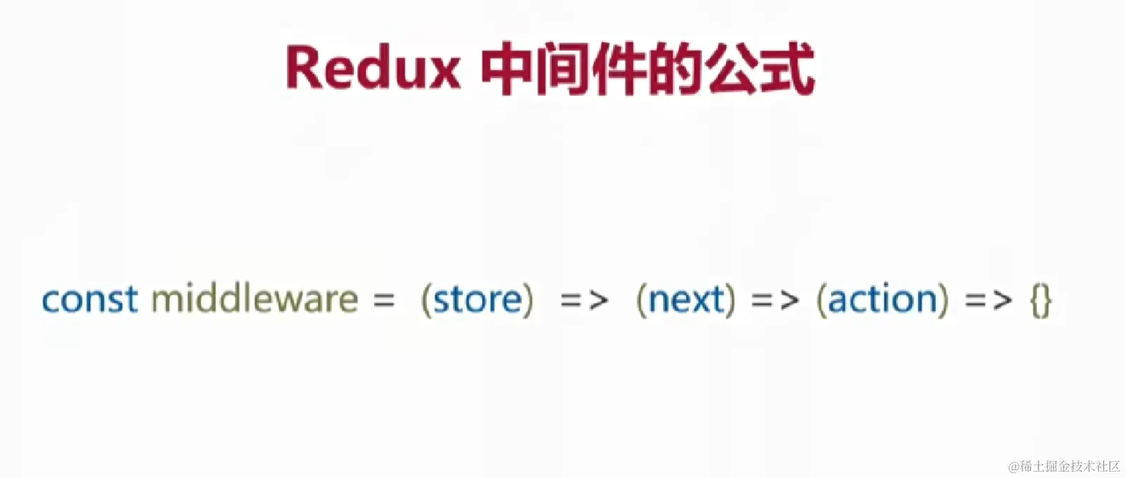 公式: const middleware (store)=>(next)=>(action)=>{}
