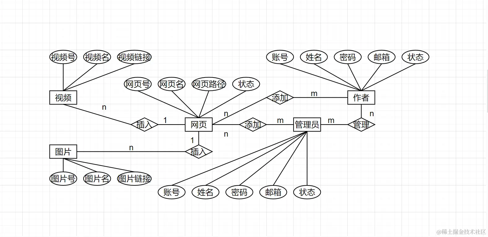 实际问题中客观存在的并且可以相互区别的事物称为实体。实体是现实世界中的对象,可以具体到人,事,物。比如上图的:管理员网页图片视频作者等。