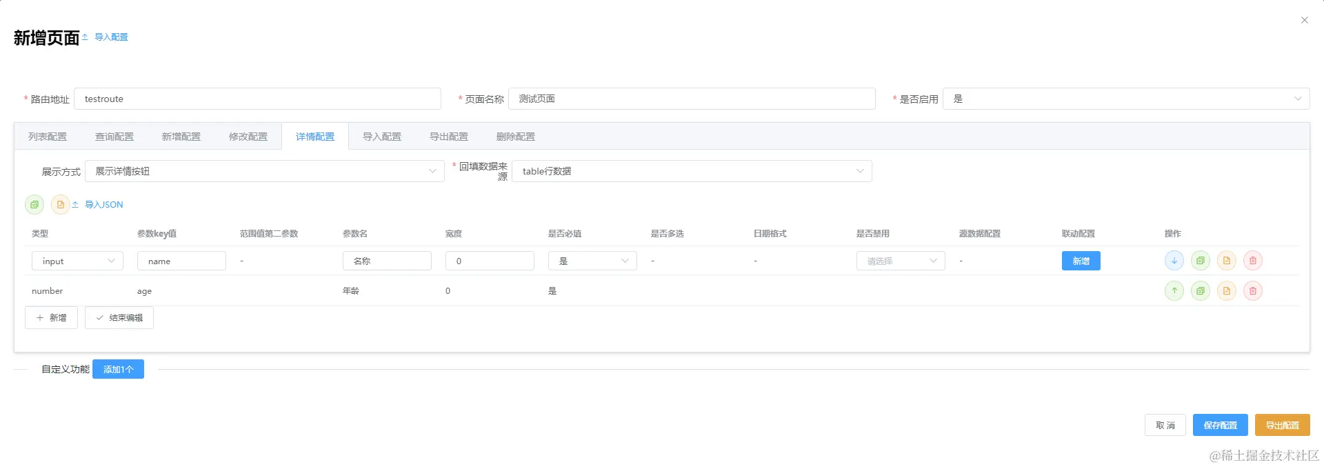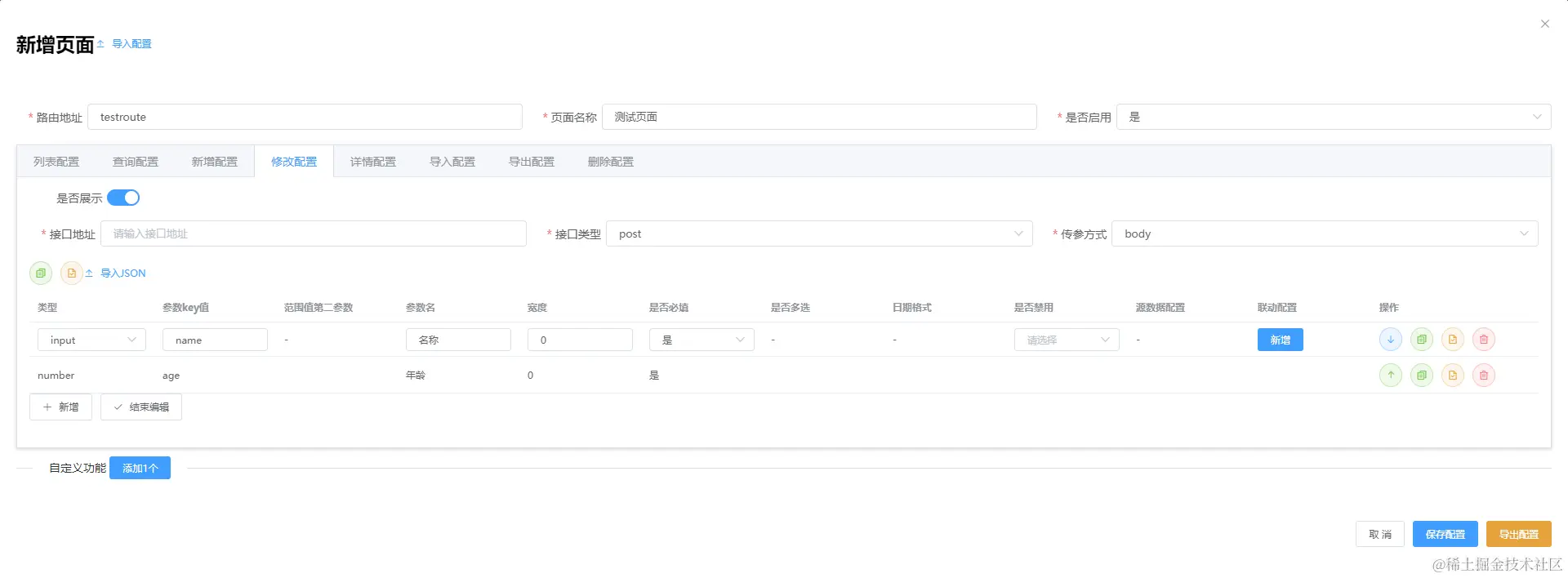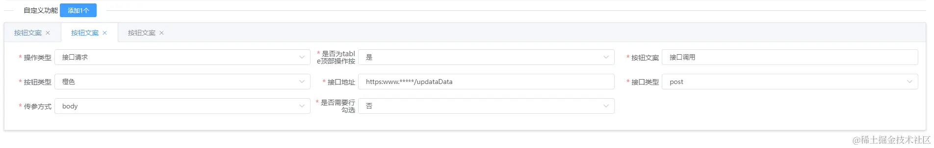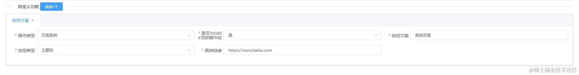 自定义操作可以有任意个,总共包含3中自定义类型:跳转地址、二次确认调用接口、表单弹窗提交