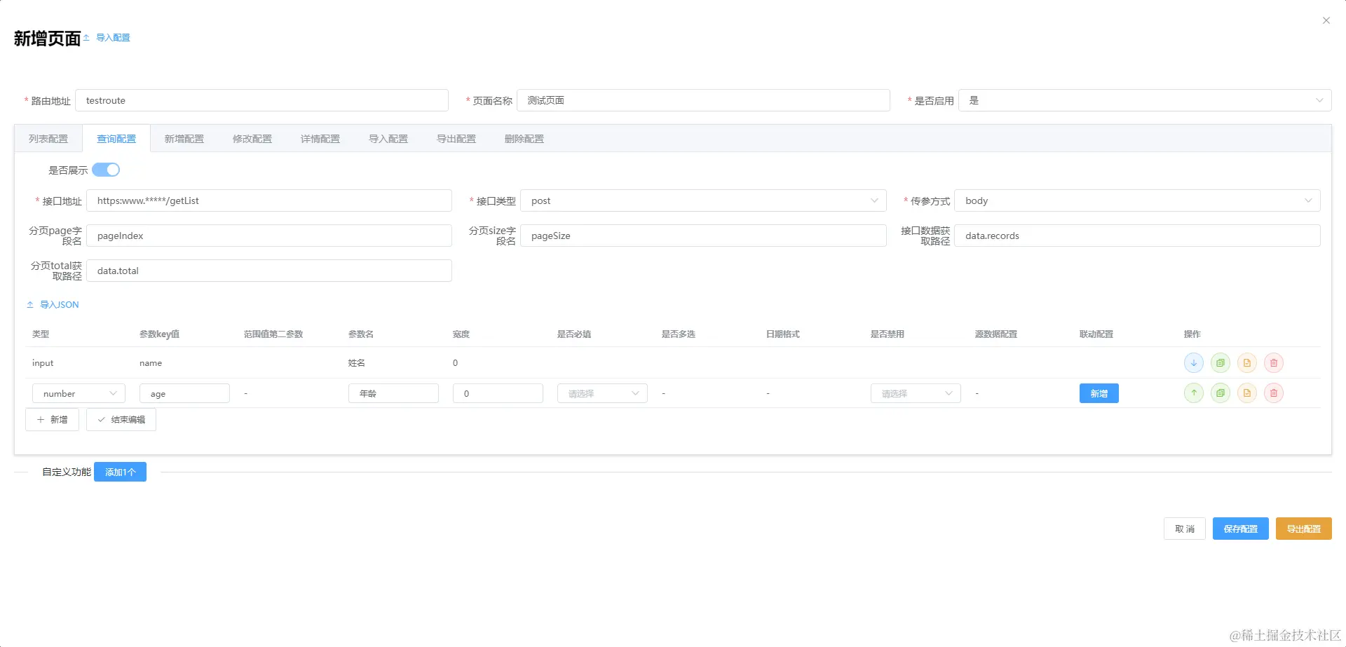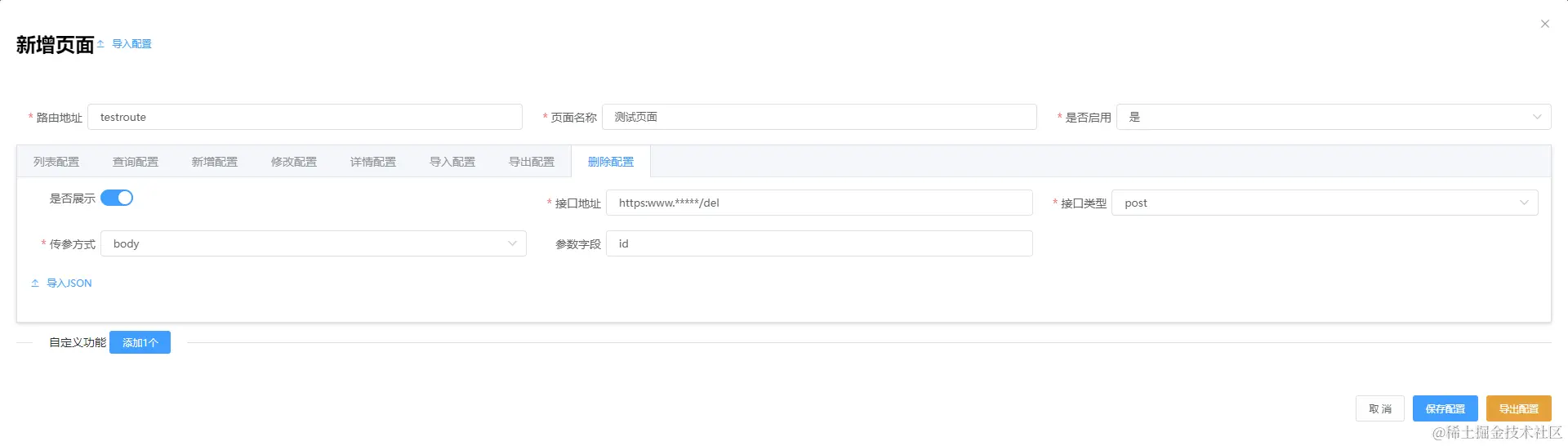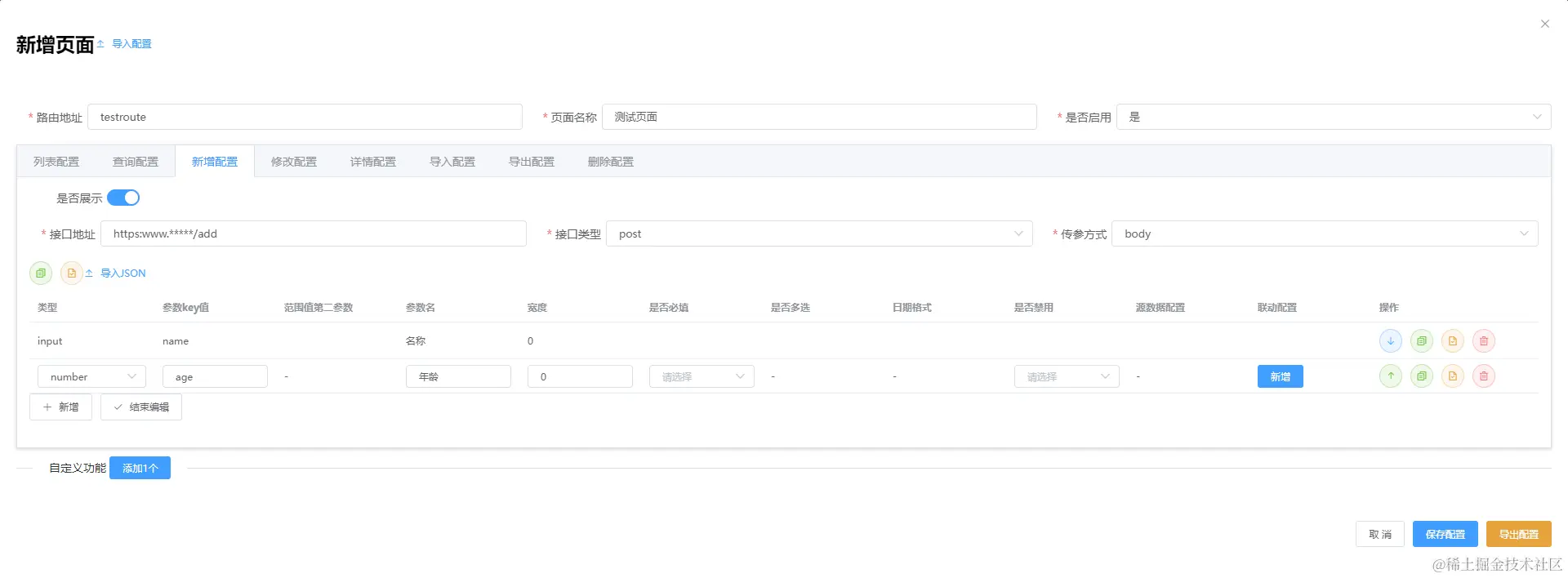 自定义操作可以有任意个,总共包含3中自定义类型:跳转地址、二次确认调用接口、表单弹窗提交