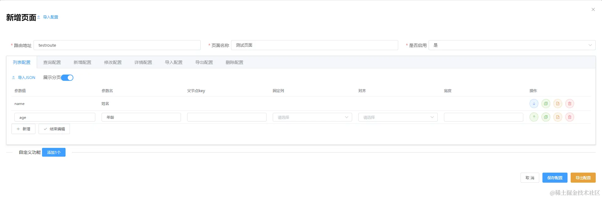 - 表格区域:由配置化表格组件+配置schema(configTable)