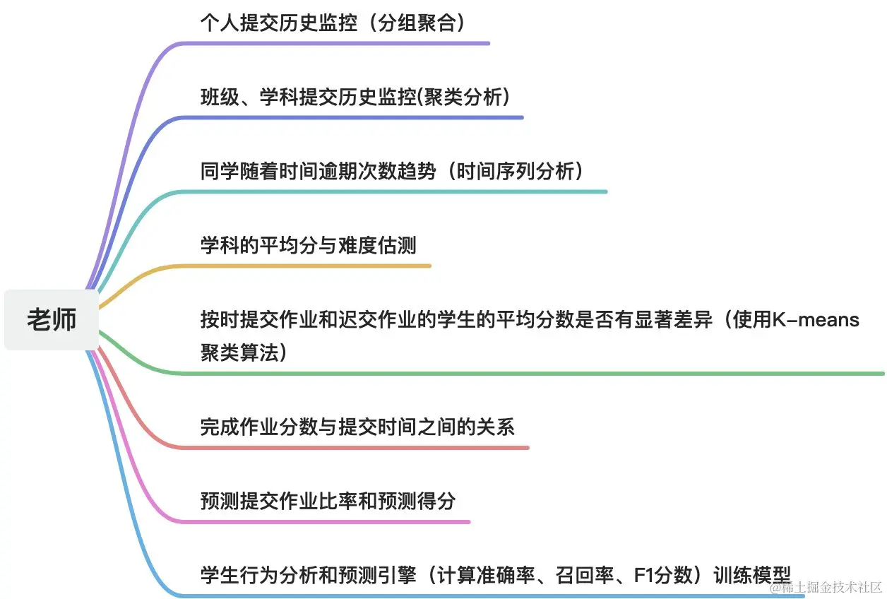 整体从这三项大方向上延伸,如:各个方向的数据分析(老师和学生都有)、反馈系统、上传用户、权限配置、作业统计等...