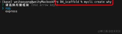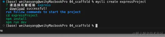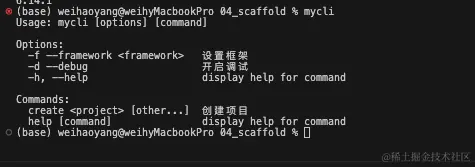 在此处,如果在终端中执行命令mycli,可以看到如下提示:按照提示,我们就可以通过create命令来创建脚手架了