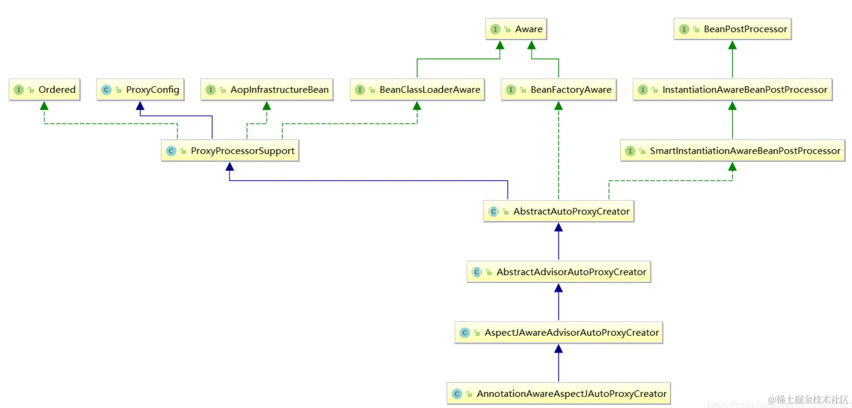 在上一篇的博文中我们讲解了通过自定义配置完成了对AnnotationAwareAspectJAutoProxyCreator类型的自动注册,那么这个类到底做了什么工作来完成AOP的操作呢?首先我们看看AnnotationAwareAspectJAutoProxyCreator的层次结构,如下图所示: