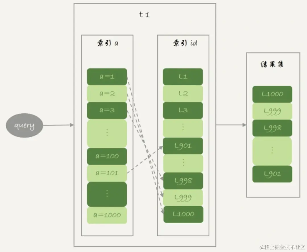 如果随着a的值递增顺序查询的话,id的值就变成随机的,那么就会出现随机访问,性能相对较差。虽然“按行查”这个机制不能改,但是调整查询的顺序,还是能够加速的。