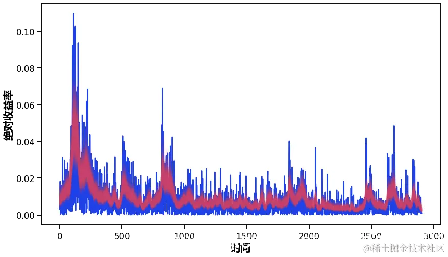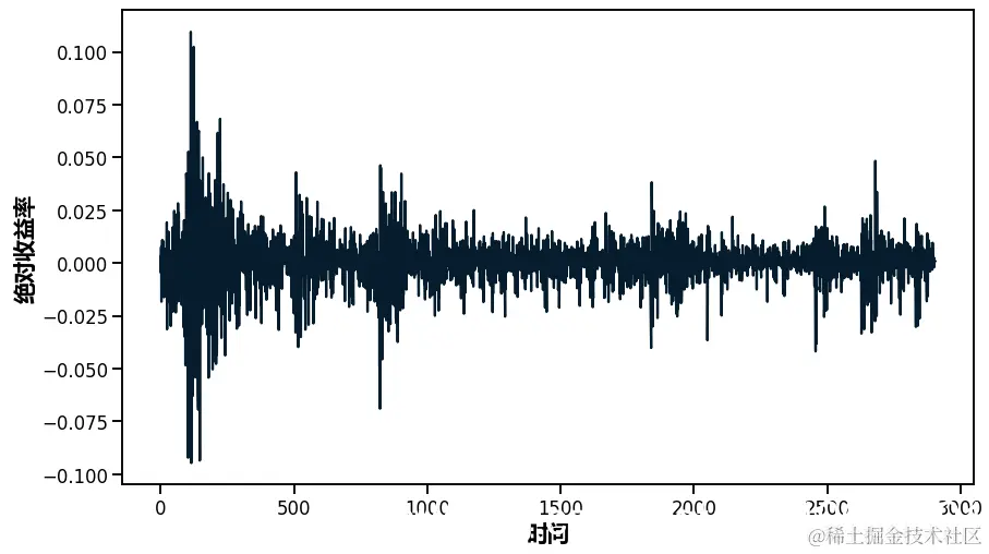 正如你所看到的,波动性似乎随着时间的推移有很大的变化,但集中在某些时间段。在2500-3000个时间点附近,你可以看到2009年的金融风暴。
