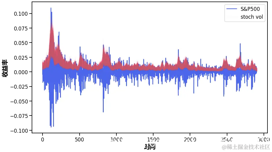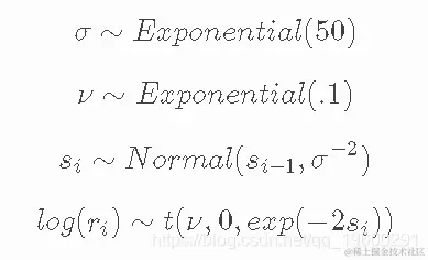 资产价格具有随时间变化的波动性(逐日收益率的方差)。在某些时期,收益率是高度变化的,而在其他时期则非常平稳。随机波动率模型用一个潜在的波动率变量来模拟这种情况,该变量被建模为随机过程。下面的模型与 No-U-Turn Sampler 论文中描述的模型相似,Hoffman (2011) p21。
