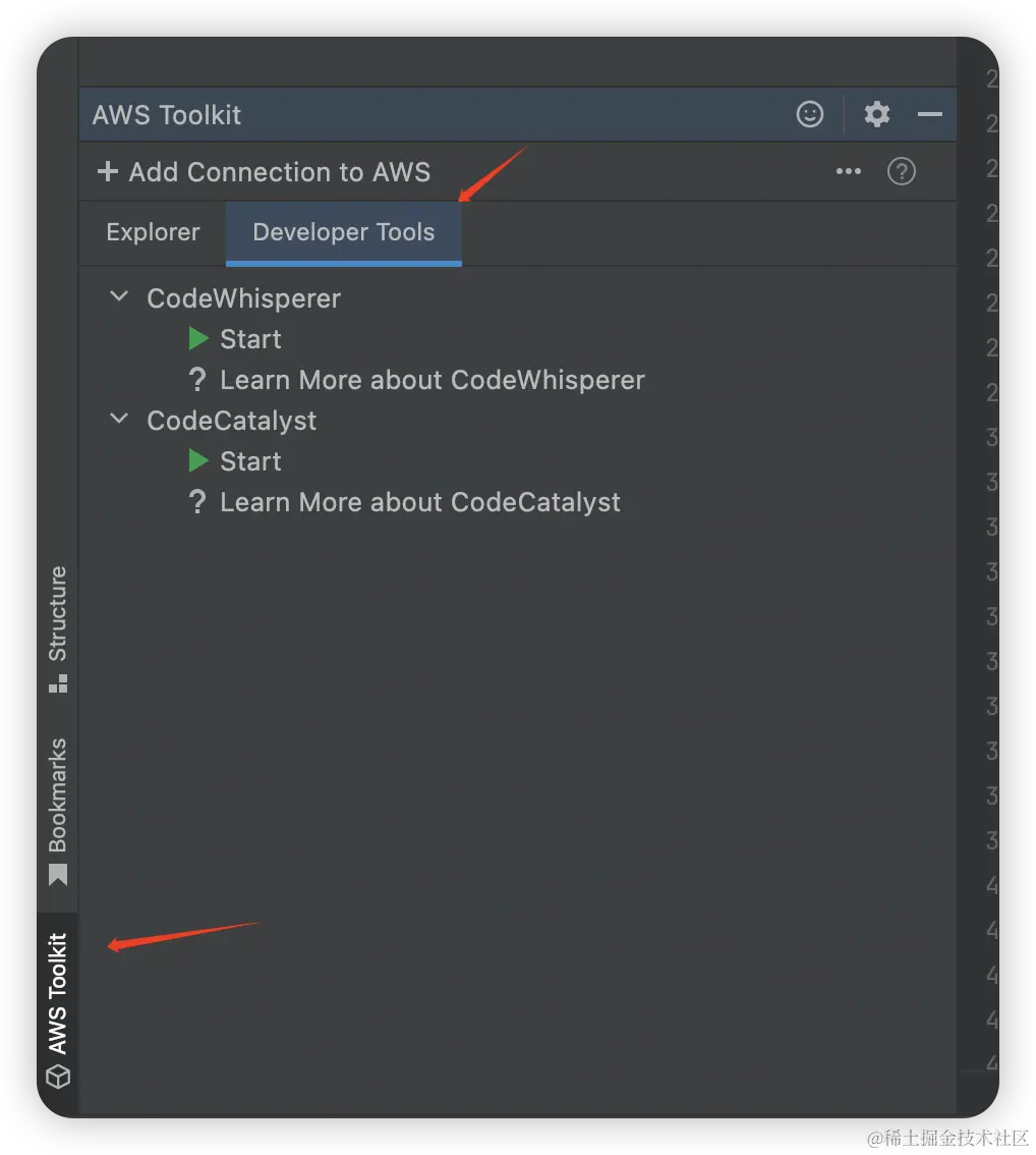 在Amazon Toolkit视图上,您将看到一个名为"Developer Tools"的标签页。点击这个标签页。