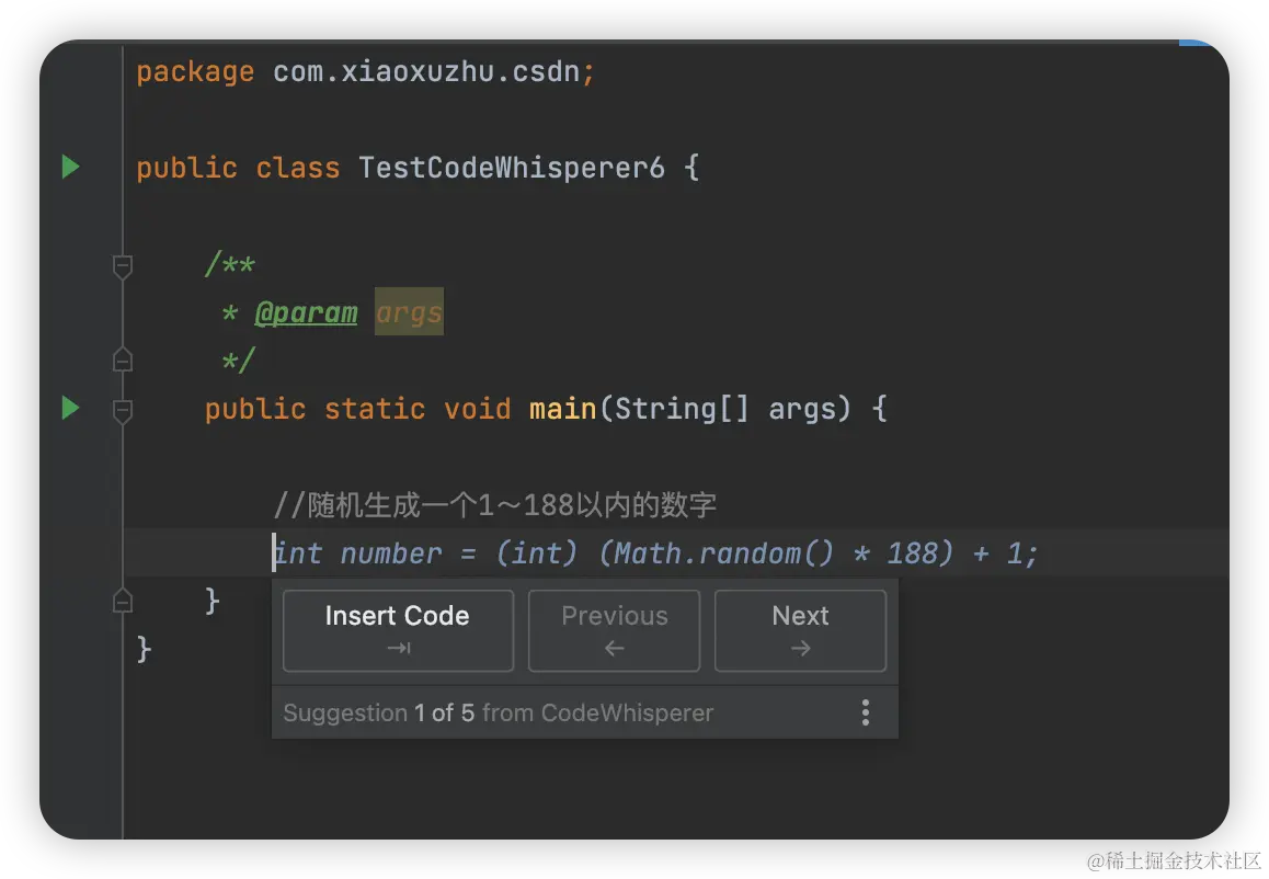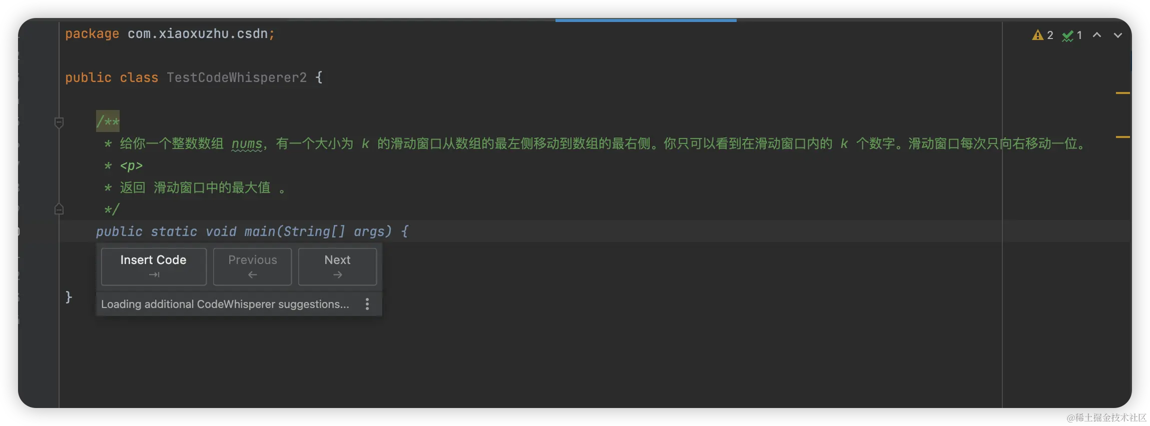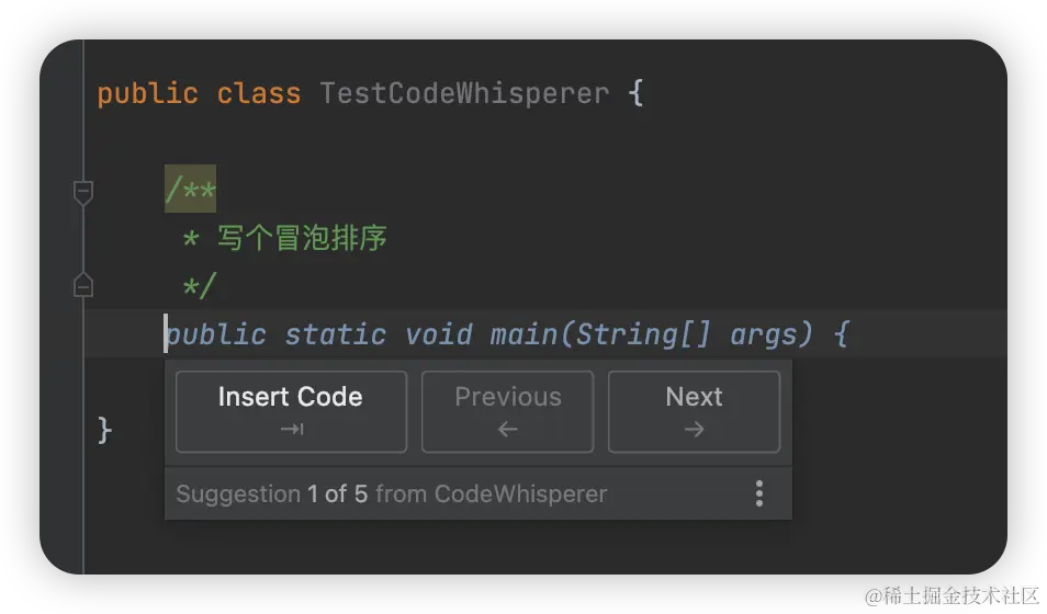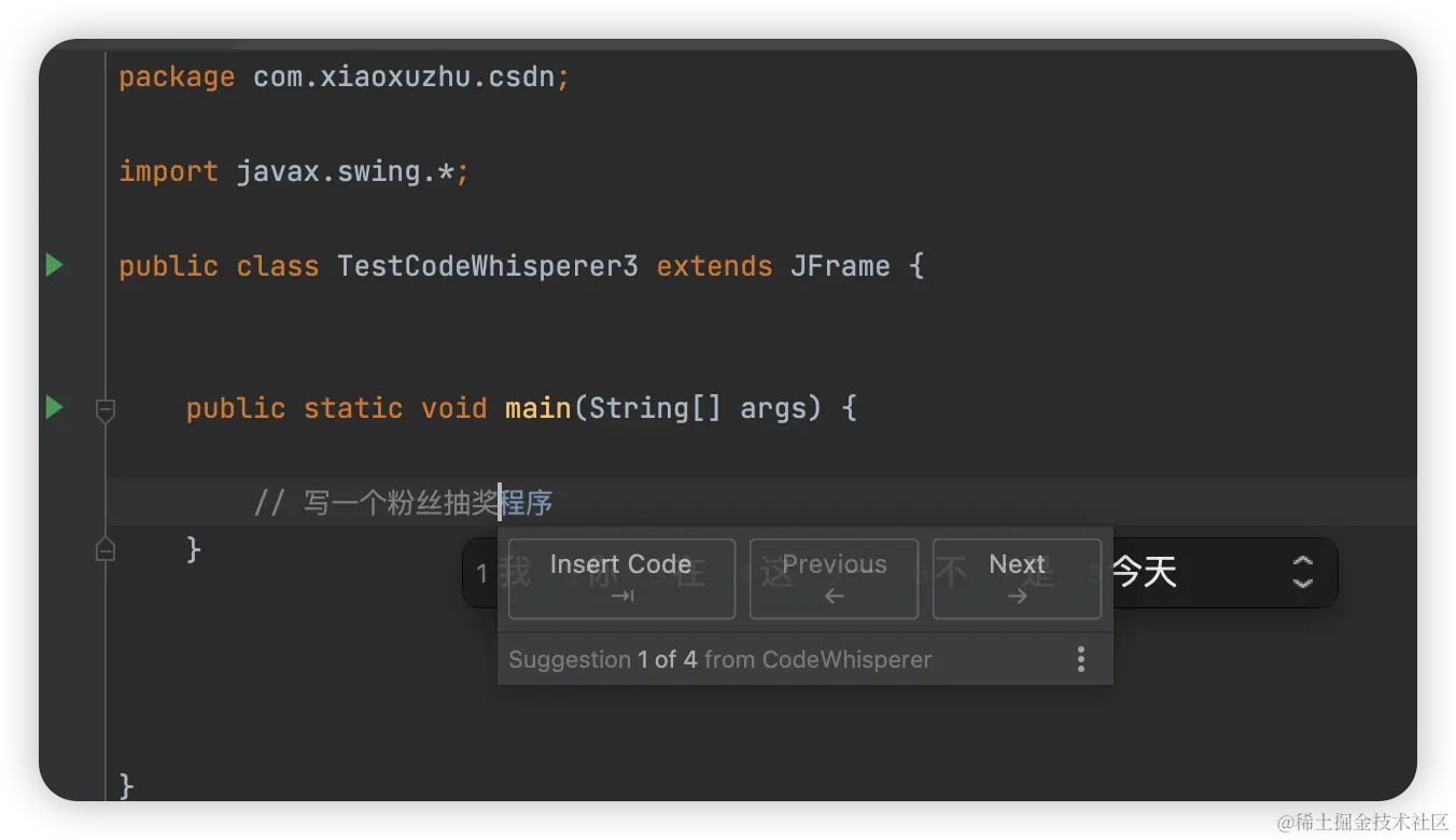 CodeWhisperer在方法体内提供了自动换行的功能。当你在方法体内按下回车键时,CodeWhisperer会自动生成后续的代码片段,以便你能够更加高效地编写代码,这里的上下文处理得很不错。