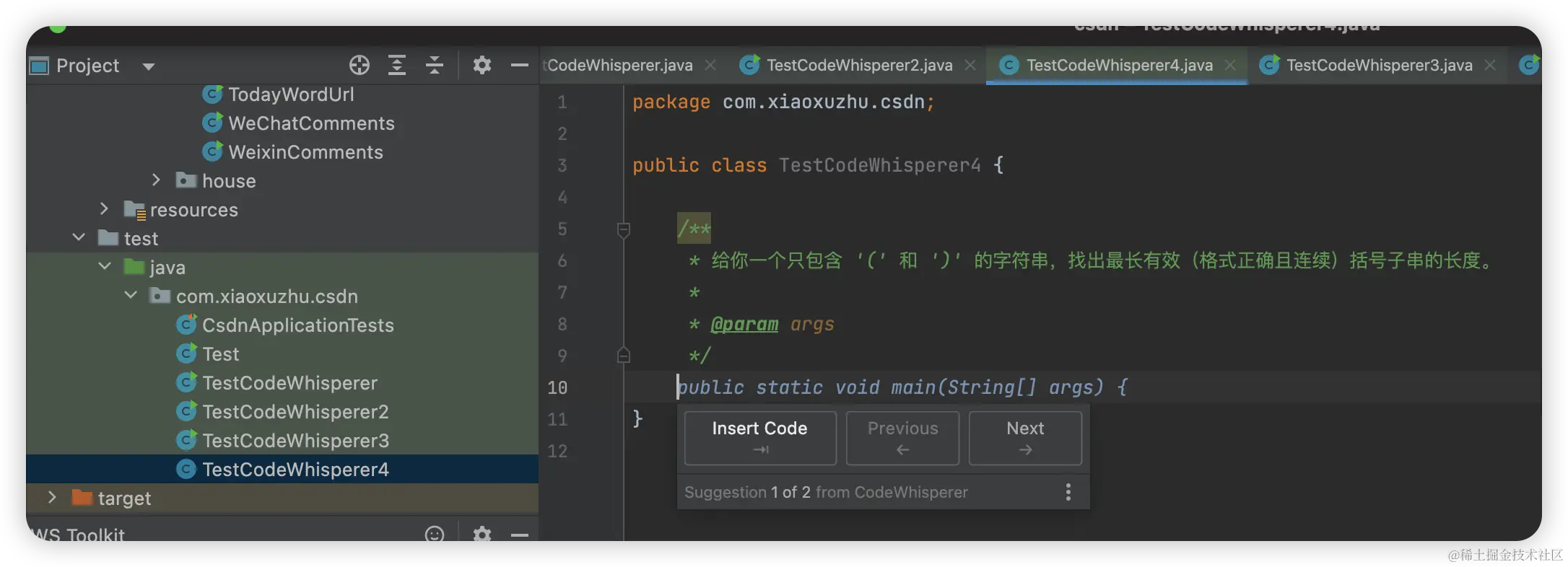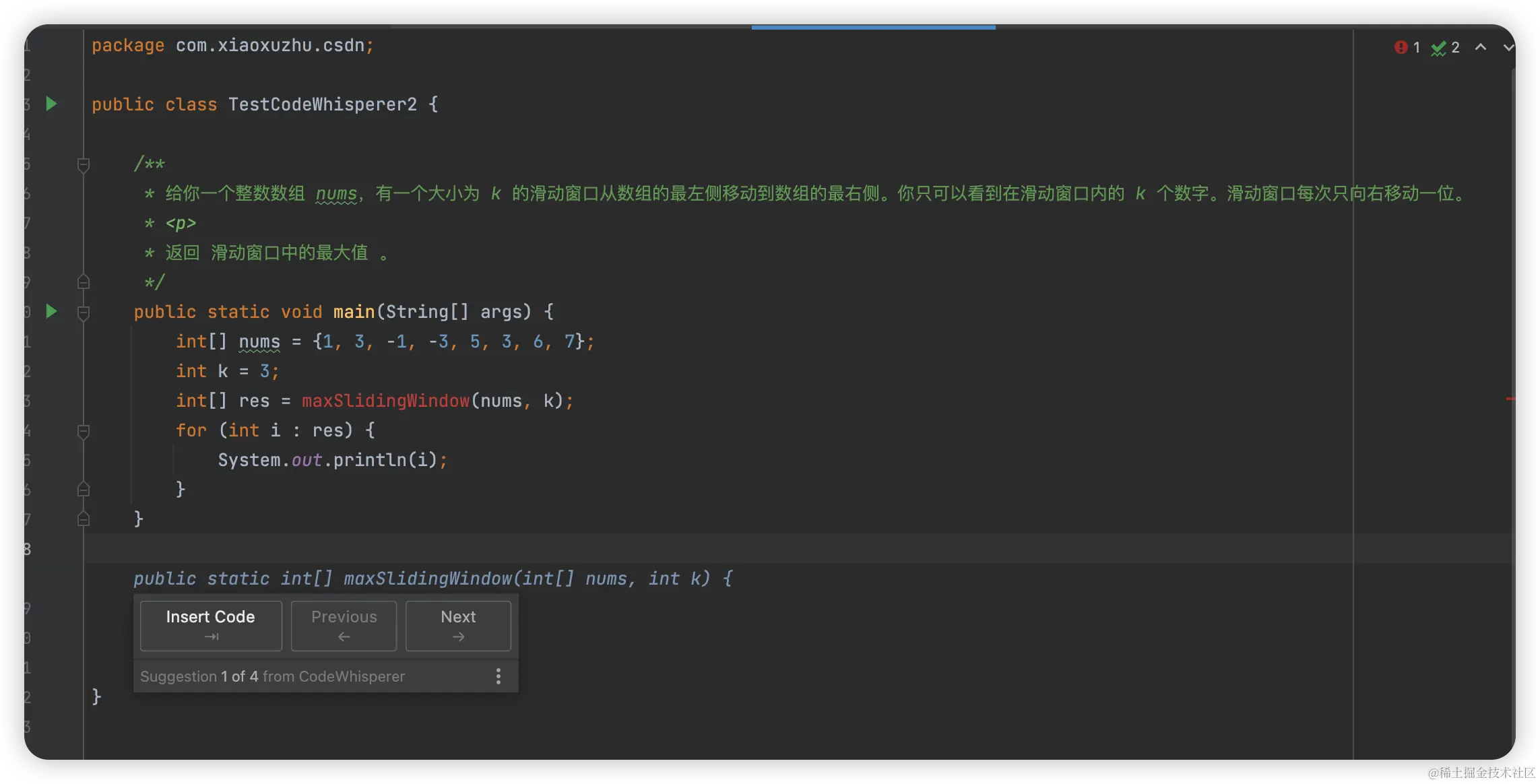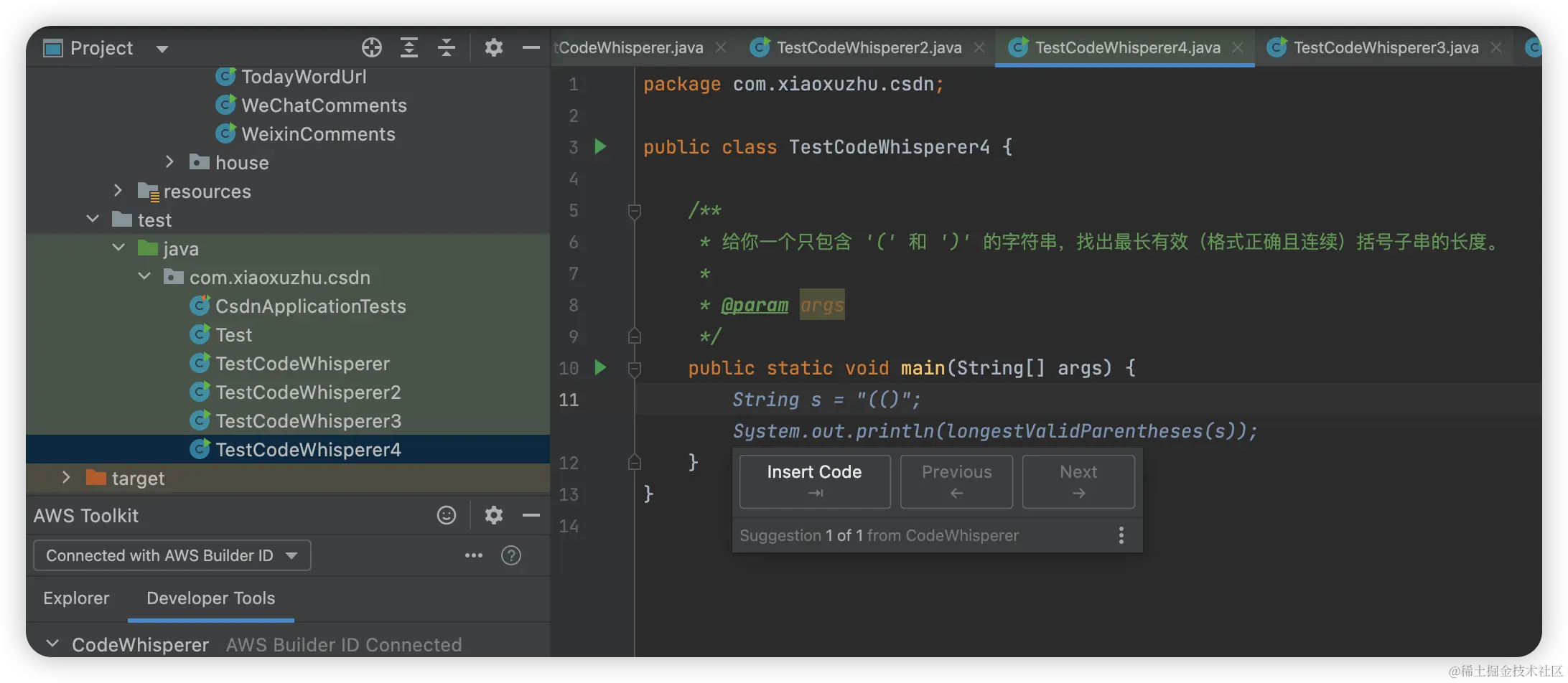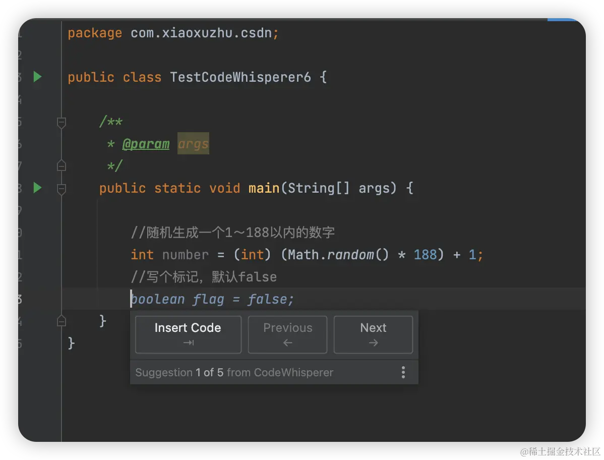 CodeWhisperer在方法体内提供了自动换行的功能。当你在方法体内按下回车键时,CodeWhisperer会自动生成后续的代码片段,以便你能够更加高效地编写代码,这里的上下文处理得很不错。