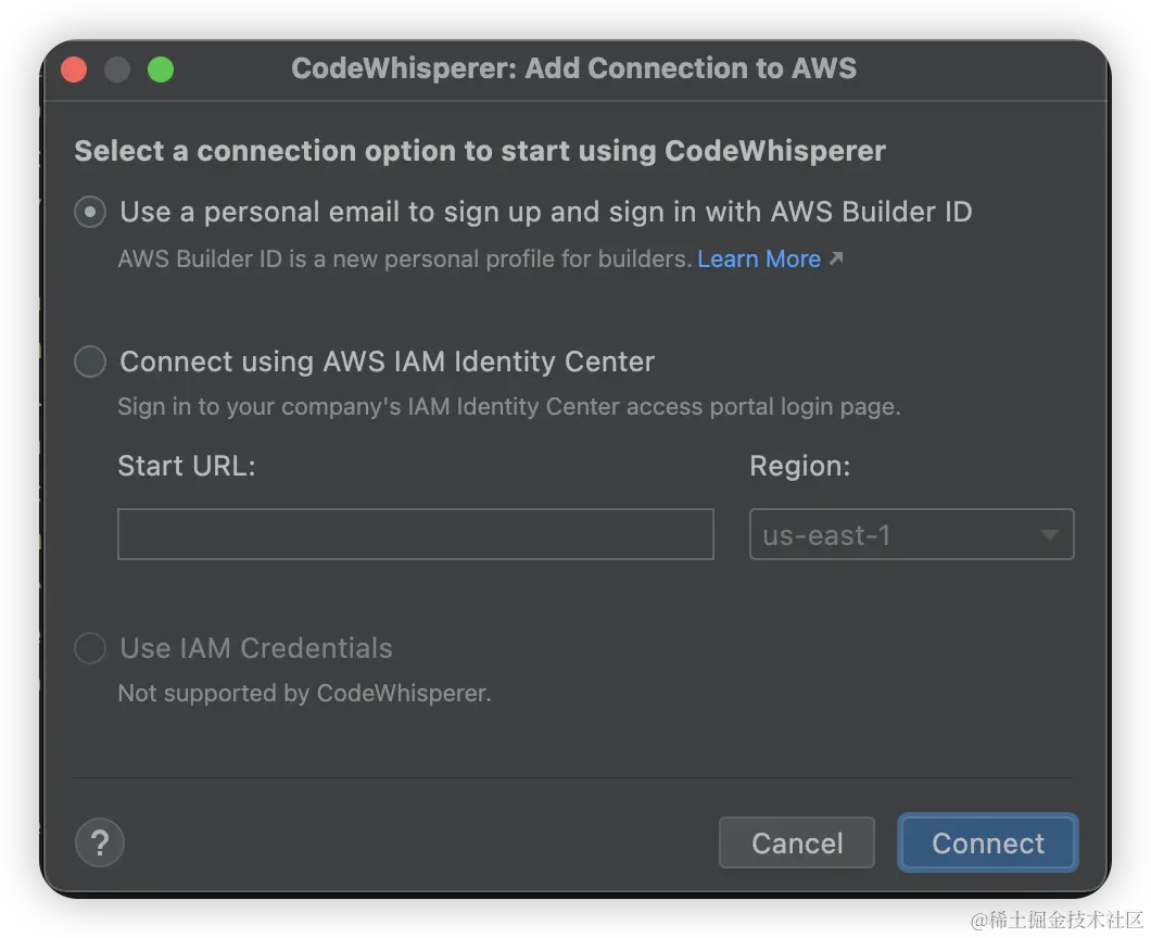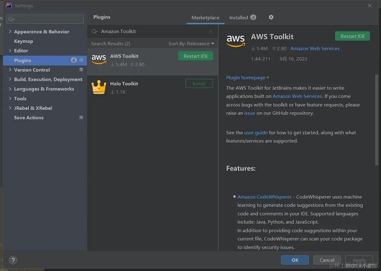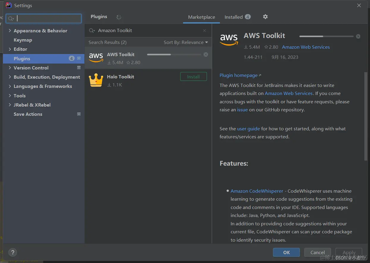 Amazon CodeWhisperer的“Amazon Toolkit”插件对idea的版本支持有限制,我从2019版本开始尝试,有不兼容问题,后面查找了资料,是从2022.1版本及以上才支持的。