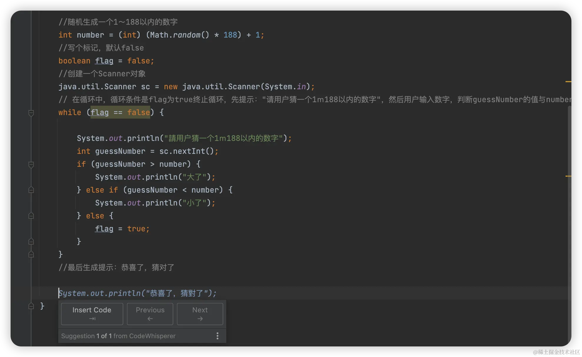 前面的四个小实战只是为了试探我们Amazon CodeWhisperer的能力,现在是时候挑战更高难度的任务了——编写一个猜数字的小游戏,看看是否能够在更复杂的上下文中理解并完成它。