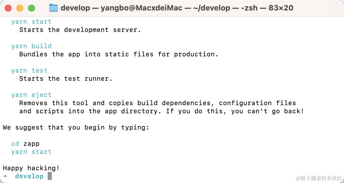 将新项目取名为 zapp,在命令行工具中,我们只需要执行如下指令,就可以创建一个 React 项目