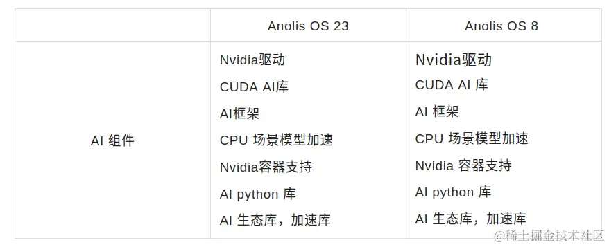 自 ChatGPT 发布以来,AI 已经在计算机领域带来一波又一波的热潮。为方便开发者,龙蜥社区选取了 AI 技术中目前最为火热的数十个组件将其引入龙蜥版本中,比如 CUDA、Nvidia 驱动、各类 AI 加速库等,使开发者和用户可以轻易地获取和使用 AI 相关的应用。此类组件支持 Anolis OS 8 和 Anolis OS 23 版本,通过 yum 即可获取。同时 Anolis OS 23 还有对应的 AI docker 镜像提供给用户。