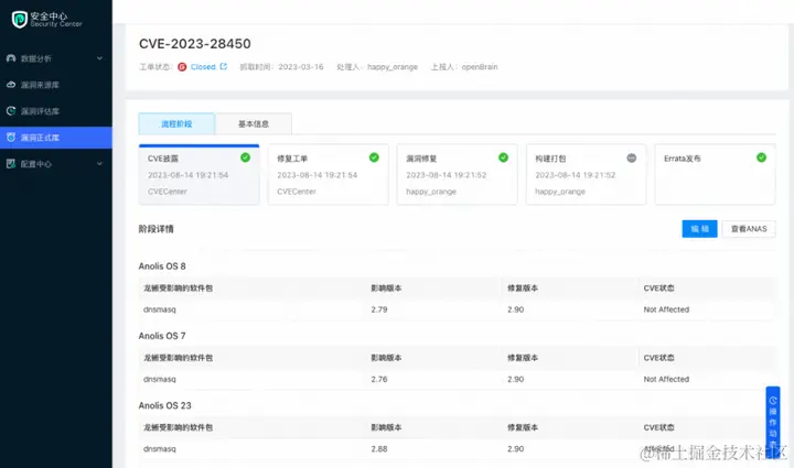 CVE Center 实现了漏洞修复全流程可视化跟踪,可以方便地查看漏洞修复进度、状态,也能方便导航到相应的修复工单,代码以及安全更新构建信息(此功能还在开发完善中),安全公告发布情况。